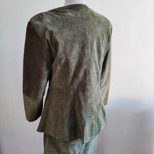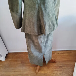 Get the drop on Fall/Winter 2024 as this one is leather AND one of the major colors trending for Fall 2024. This one came out of a time capsule unscathed. Olive green suede skirt and jacket. Smooth suede. Skirt zips and buttons. Jacket buttons down as well. Wear as separates or as a set.