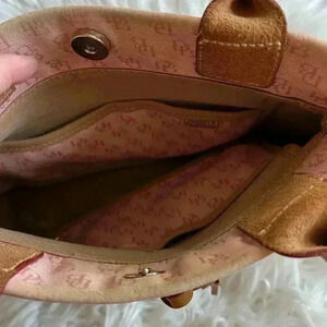 This charming vintage Dooney & Bourke tote bag features a pink canvas body with the signature DB monogram print, complemented by tan leather handles and accents. The spacious interior with a magnetic snap closure makes it perfect for carrying everyday essentials. It’s an ideal bag for casual outings or adding a touch of vintage flair to any look.