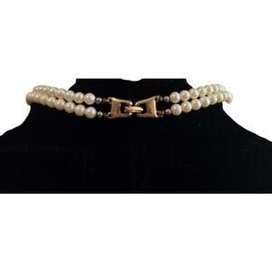Vintage Double Strand Faux Pearl Blue Stone Filigree Center Pendant Necklace