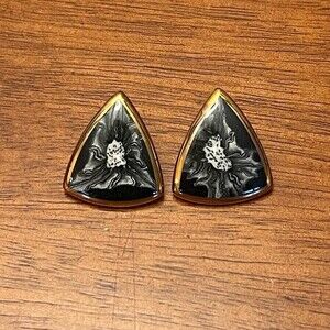 Vintage Handmade Abstract Black and Grey Floral Drop Earrings. Abstract sunflower design with gold tone edging. Feels lightweight, possibly resin. Triangular shape with stud backs for pierced ears. A little under 1" wide at the bottom. Excellent vintage condition. No flaws.
