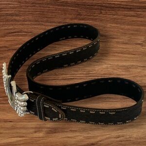 Vintage Etched Leather Rhinestone Horseshoe Black Belt w/Detachable Hardware XL