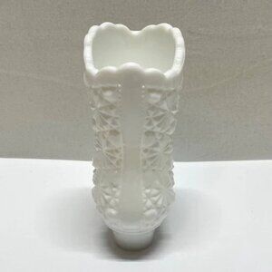 The Vintage Fenton Milk Glass Dairy Button Boot is a collectible art shoe vase standing at 4.25 inches tall. This English Hobnail patterned shoe figurine is made of white glass with a textured, 3D effect design. As a part of the Fenton product line, this original piece is a decorative and unique addition to any pottery and glassware collection, perfect for art enthusiasts and collectors of vintage Fenton pieces.