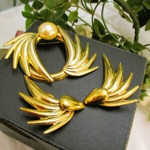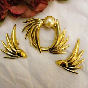 Vintage GIVENCHY Gold Plate Winged Brooch and Earrings Set: DESIGNER Pearl Gold