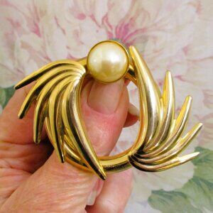 Stunning, Vintage, Haute Couture, Winged Design, Gold Plate and Faux Pearl Brooch and Clip Earrings Statement Set by GIVENCHY, PARIS-NEW YORK**.
