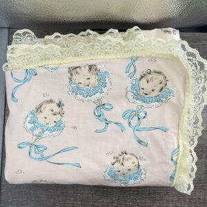 Vintage Gerber Baby Faces Print Blanket Lace Ruffle Reversible Pink Blue Yellow