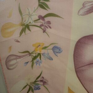 Vintage Halston Lifestyle 100% Silk Delicate Scarf. Pale Yellow Background, Pink Purple Vase Motif, 20"x20". Good Pre-Owned Condition