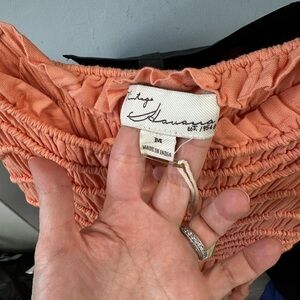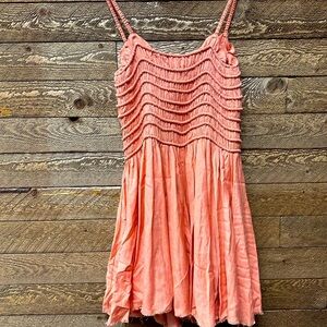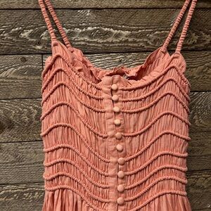 Gorgeous peach-toned mini dress from Vintage Havana. Features a flattering smocked bodice with decorative button front and adjustable spaghetti straps. The flowy skirt with raw hem adds a playful, boho vibe—perfect for summer outings or casual events.