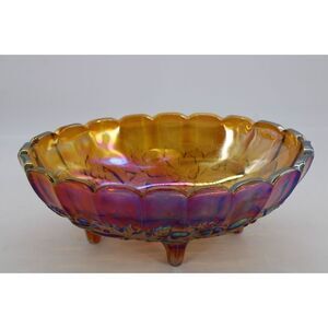 This beautiful vintage footed fruit bowl is sure to add a touch of elegance to any home décor. Made of high-quality carnival glass, the 12" x 8 1/2" x 4 1/2" bowl features a gorgeous iridescent finish that glows in the light. Perfect for displaying fruits or as a centerpiece, this bowl is a must-have for any collector of vintage glassware.