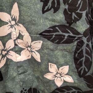 Color: Background is a medium green with black and white hibiscus, a Hawaiian flower
