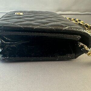 This sleek Jay Herbert bag features a high-shine black patent leather exterior in a classic quilted design. Finished with a gold-tone chain strap and signature logo detail, this compact crossbody adds instant polish to day or evening looks.