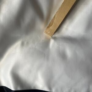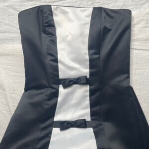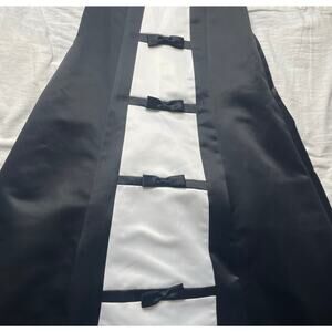 Vintage Jessica McClintock for Gunne Sax black and white formal gown, size 7/8. Features a satin black with white center, black bows, flared full length skirt, back zipper closure, and a tulle and lining underneath. Good preowned condition. Has some spots on the front (some at the top and some near the bottom hem).