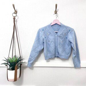 Vintage Kids Cropped Blue Cardigan with Embroidered Flowers Size 10-12