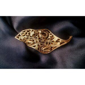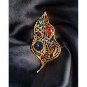 Designed in the shape of a stylized leaf or feather, this piece is a symphony of color and craftsmanship. The delicate filigree gold-tone setting cradles a breathtaking arrangement of multi-colored rhinestones in rich jewel tones—sapphire blue, emerald green, ruby red, amber, and aquamarine. Each stone is meticulously placed to mimic dewdrops caught in golden foliage. 🍃💎