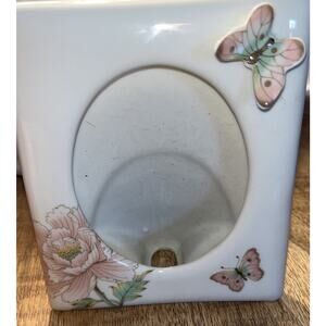 This vintage picture frame from La Bella Butterfly features a beautiful all-over butterfly pattern on white porcelain. The frame is suitable for a 3x4 photo and has a portrait orientation. The item height interior is 6 inches. It is an original piece from the 1980s, suitable for adults, and has a butterfly theme.