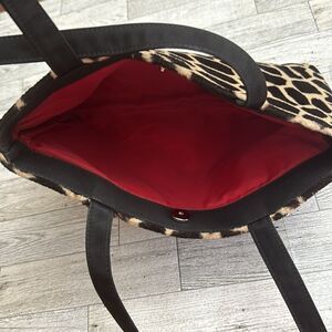 Vintage Lancôme Giraffe Faux Fur Shoulder Bag. Excellent condition. Brown & Tan faux fur exterior, black nylon straps, red nylon lining, top magnetic snap closure. Measures 12.5” x 7.5” with a 10” strap drop.
