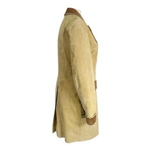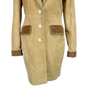 features: 100% suede leather outer with a contrasting light and dark leather. Mid length. V neckline with embellished trim. Pockets. back slit. Lined. Button closure.