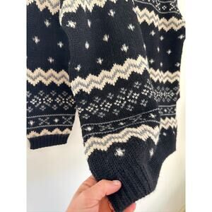 Chic Liz Claiborne sweater featuring a stylish Fair Isle pattern in elegant black and cream colors. This cozy piece is perfect for keeping warm while looking fashionable during colder seasons. Made from 100% wool for a luxurious feel. Ideal for casual outings or cozy nights in.
