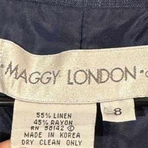 Timeless vintage Maggy London dress made in Korea, featuring a soft navy blue linen-rayon blend, structured collar, short sleeves, and a full front button closure. Size 8. Elegant and easy to wear, this midi-length silhouette works beautifully for cottagecore, office chic, or summer minimalism.