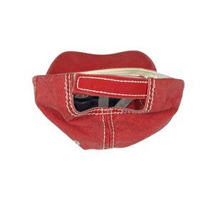 Pre-owned with distress and  fading on the red fabric. Interior discoloration