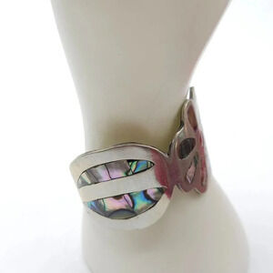Vintage Mexican Abalone Inlay Coin Silver Cuff Bracelet With Flower Design