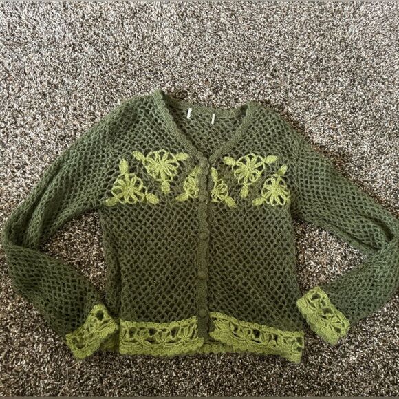 Vintage Mohair Open Crochet Cardigan Sweater Sz Small Green Floral Embroidered