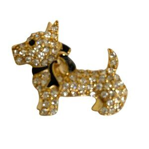 This vintage brooch showcases a whimsical Scottie dog design, adorned with dazzling rhinestones and a chic black bow. Its gold-tone finish exudes vintage charm, making it a delightful addition to your jewelry collection. Measuring approximately 2 inches, this pin is a statement accessory that reflects playful elegance and timeless style.