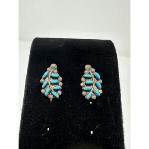 Vintage Native American Sterling Silver + Turquoise Stud Earrings Leaf Shape