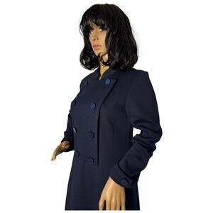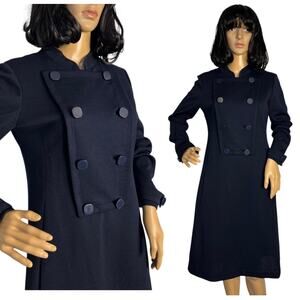 Vintage navy blue double-breasted dress, possibly from the 1960s. It shares design elements with a pea coat or military-style coat, featuring a double-breasted button closure and a structured silhouette. Vintage navy pop over style dress, very nice front double breased feature with the buttons on right opening to zip closing underneath as shown on picture ten