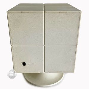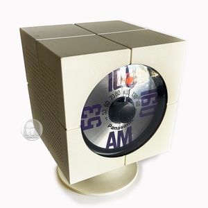 Preowned, vintage Panasonic Matsushita transistor radio, model #R-47A Centerport aka the cube radio, from the early 1970s. Very cool futuristic style with removable "tulip" base and silver metal dials on the side for tuning and on/off/volume. Perfect for the mid century modern home - or for anyone who enjoys vintage electronics! Preowned/vintage (40+ years old) with definite signs of use and prior display: some scratching and marks to case (most notable on the bottom); some yellowing to the white case from age; radio works (as you can see and hear in our video) and takes one 9V battery to run (included). No box but will be carefully packaged for shipment. Measures appx 3in H x 3in D x 3in L.