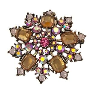 This lovely brooch is gold toned and features a variety of crystals in a snowflake design.