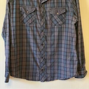 Vintage Point Zero L plaid casual button down t-shirt gray blue long sleeve