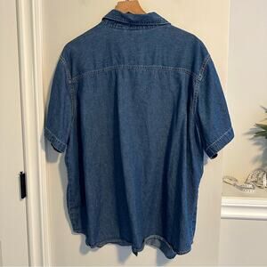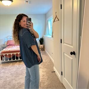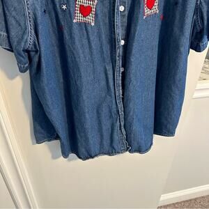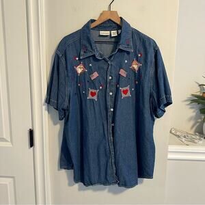 I love this super fun true vintage Quizz blue denim cotton American flag embroidered patriotic short sleeve collared button front top/blouse