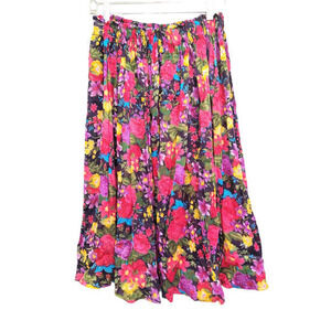 Vintage Red Pink Yellow Floral Sheer Elastic Waist Pleated Maxi Skirt