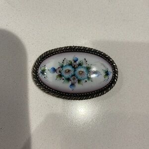 Vintage Russian Finfit Enamel, Porcelain Hand Painted Flower Silver Filigree Pendant, Baby Blue, Roses, Flowers Bouquet—Brooch & Pendant—Beautiful!! Excellent condition!!