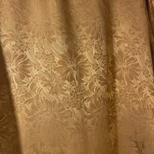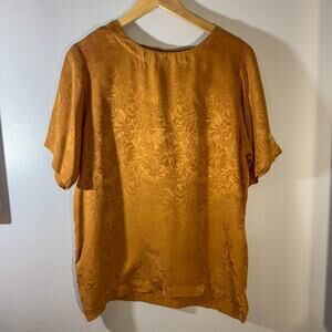 Elevate your wardrobe with this luxurious vintage short-sleeve top from STUNT Collections. Crafted from 100% pure silk, the fabric features a beautiful, subtle jacquard (damask) weave with a continuous floral/foliage pattern that catches the light with a rich, shimmery texture. The color is a deep, warm burnt orange, terracotta, or rustic gold—a key color for the current season.