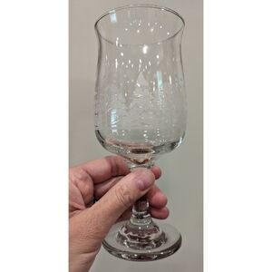 Excellent pre-owned condition. Vintage Libbey for Arby's winter scene etched glass tulip style wine glasses. Gold rimmed. Set of two