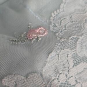 This beautiful vintage Shadowline sleepwear set in a delicate powder blue is the epitome of classic elegance. Made in the USA, the set includes a flowy nightgown with a V-neck and a matching robe. Both pieces feature intricate lace detailing and small pink floral embroidery, adding a touch of romance.
