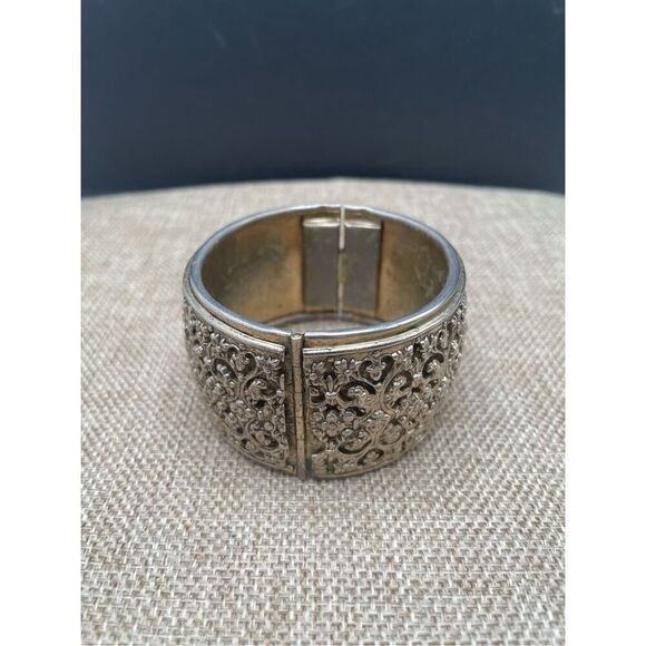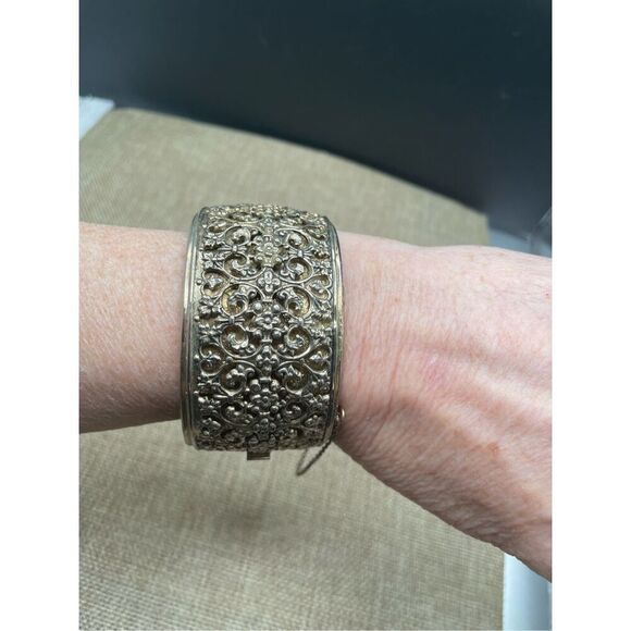 Vintage Silver Tone Wide Cuff Bangle Bracelet Scrolled Fancy Safety Chain