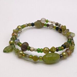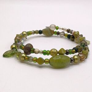 Vintage Spiral Wrap Bracelet with Multiple Shades and Shapes of Green Glass Bead