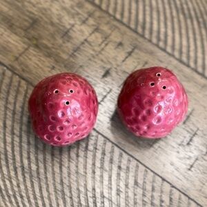 Adorable ceramic, hand-painted vintage strawberry shakers. Plastic stoppers missing from the bottom.