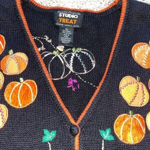 Vintage Studio Treat Knit Halloween Fall Autumn Vest Size XL Pumpkins Candy corn EUC