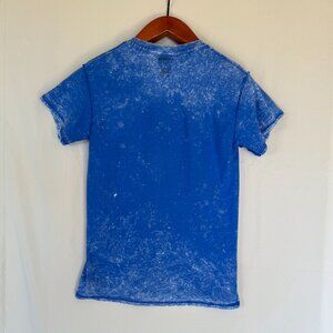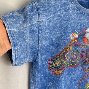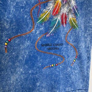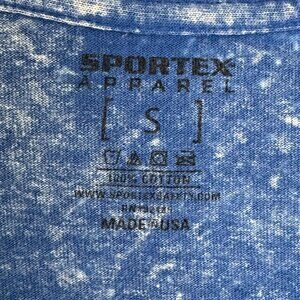 This VinTage T Shirt from Sportex. Apparel was Made in the USA and constructed in 1000% Cotton blue acid wash jersey fabric. It features a round crew neckline, debossed puff paint native american horse print and a classic T shirt silhouette. This is boho, vintage, southwestern, artsy, retro vibes.