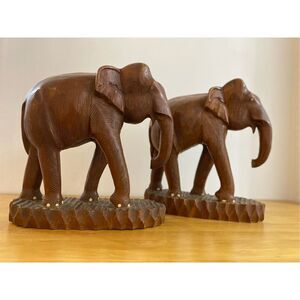 Vintage Teak Wood Hand Carved Elephants - Sculpures Bookends
