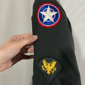 Features classic four-pocket front, brass Great Seal buttons, epaulettes, and a full green lining. This example includes embroidered sleeve patches (a Specialist eagle insignia and star roundel), adding unique character for fashion or display.