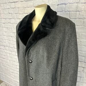 Lovely herringbone pattern on this dress men’s coat. Faux fur collar and lining on the inside, sleeves are quilted lined. Inside tag says dry clean only.