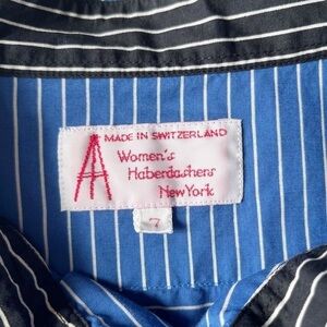Vintage Woman’s Haberdashers New York button front pinstripe button front shirt with long sleeves. Blue and white color with contrast black and white lining for cuffs and collar. Very light weight cotton. Made in Switzerland. Great condition, no defects.