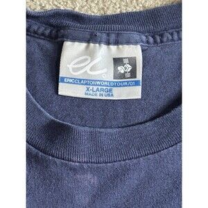 The Vintage Y2K Eric Clapton World Tour 2001 T-Shirt in Size XL is a retro piece perfect for any music fan. This navy blue shirt features a graphic print of Eric Clapton's logo, representing the iconic rock guitarist. Made of cotton knit fabric, this short sleeve shirt with a crew neck is machine washable and offers a regular fit. The shirt is a limited edition piece from the year 2000-2009, embodying the 90s music theme. This vintage shirt is a must-have for collectors and fans of Eric Clapton and classic rock music.