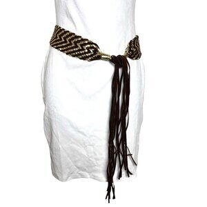 Vintage Y2K gold & brown wide statement belt suede fringe ties shut One size
