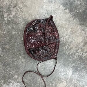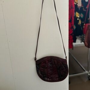 Stylish crossbody bag with a unique textured design. Features a rich burgundy color. Perfect for any occasion.