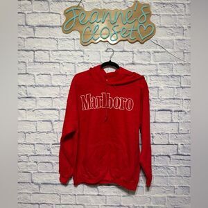 Vintage 90’s Marlboro Logo Red Drawstring Hoodie Sweatshirt Size L